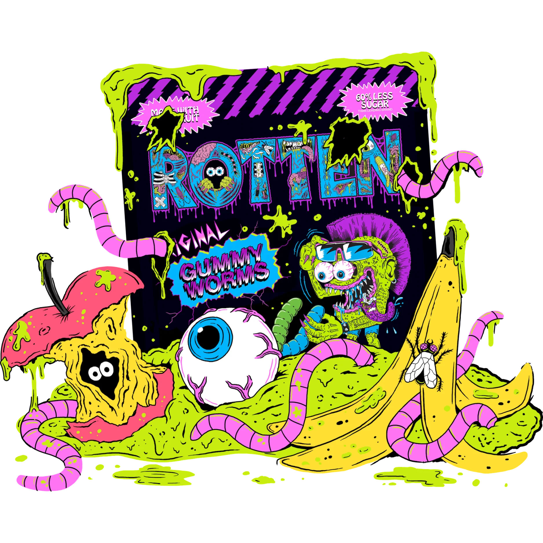 Developed in our laboratory by the infamous Dr. Rotten, our candy is made with 60% less sugar so they won’t turn your guts into goo.